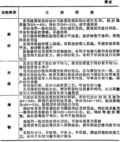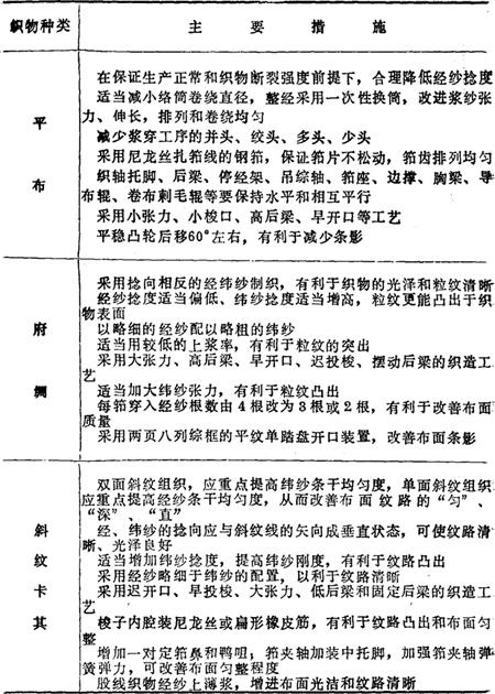 注:①表中括号数字为相应英制表示法。 ②化纤混纺纱混纺比例分别为:T/C:65/35;V/C:50/50;T/R:65/35。 4.改善织物外观效应的措施(表18-192) 表18-192 改善织物外观效应措施