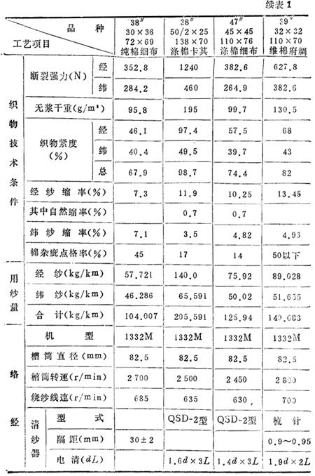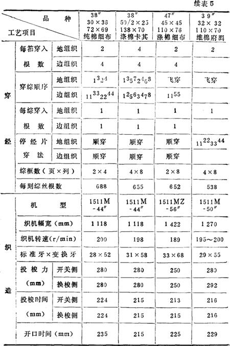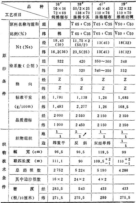 四、棉织工艺设计实例 以96.5cm 19/16 283.5/271.5(38″ 30×36 72×69)纯棉细布、96.5cm 11.75×2/23.5 543/275.5(38″ 50/2×25 138×70)涤棉卡其、115.5cm 13/13 433/299(47″ 45×45 110×76)涤棉细布、99cm 18/18 433/275.5(39″ 32×32 110×70)维棉府绸四个织物为例,设计工艺技术参数见表18-193。 表18-193 几种织物工艺设计示例