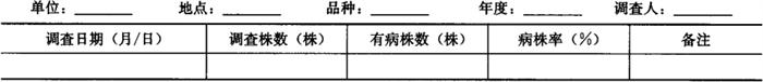 2.2 大田普查 根据系统调查结果,在棉花枯萎病盛发期,依据棉花栽培区划和常年发病情况,在各代表区域内选有代表性的棉田10~15块,每块田采取5点取样,每点调查单行10株。记载发病株数,统计病株率。结果记入表5-4。 表5-4 棉花枯萎病大田普查表
