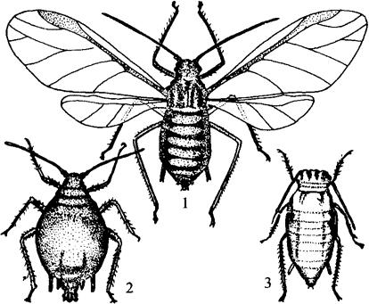 图5-79 棉蚜 1.有翅成蚜 2.无翅成蚜 3.若蚜 【生活习性】 1年发生20多代。以卵在木槿、石榴等枝条上越冬。翌年春天气温上升到10~11℃时孵化。先在越冬植物上为害,经3~4代后产生有翅迁移蚜,于4~5月迁移到棉花等夏季寄主上蔓延,此时也为害菊花;9~10月份产生有翅迁移蚜,飞到木槿等寄主上继续繁殖为害。11月寒冷时,产生有翅雄蚜和无翅雌蚜,交尾产卵。 棉蚜一般胎生,只在越冬前才生产卵型雌蚜。蚜虫迁移,除靠飞行外,爬行力也很强。繁殖最适温度为16~22℃。当气温在25~27℃以上,相对湿度在75%以上,蚜虫数量下降。气候适宜时,4~5天繁殖1代,而且繁殖量大。一雌蚜平均每天产5头小蚜虫。天气寒冷时需19天才能繁殖1代。连续暴雨,棉蚜发生数量明显下降。 【防治方法】 (1)清除菊花等花圃周围棉蚜的越冬寄主。可减少虫口,以利热带兰生长。 (2)棉蚜发生期,可选喷杀螟松、敌敌畏、氧化乐果各1000倍液喷雾防治。 |