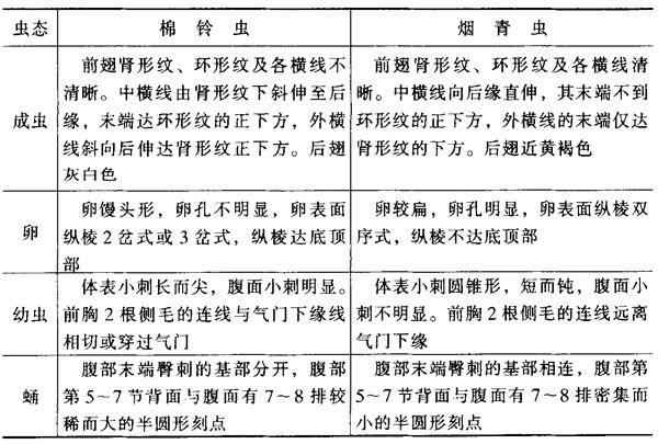 | 释义 | 棉铃虫与烟青虫 【释文】: 棉铃虫又称棉铃实夜蛾、番茄蛀虫。烟青虫又称烟夜蛾。都属鳞翅目夜蛾科昆虫,是两个近缘种。棉铃虫广泛分布于世界各地,我国各地均有发生。烟青虫分布也很广泛。 1.寄主与为害 棉铃虫和烟青虫食性都很杂,寄主很广。棉铃虫寄主多达250多种。在蔬菜上主要为害番茄、甜椒、辣椒、茄子、南瓜、豆类、甘蓝、白菜等。烟青虫寄主也很多。蔬菜上主要为害甜椒、辣椒、番茄、南瓜等。在大棚、温室蔬菜生产中,棉铃虫主要为害秋棚番茄,烟青虫主要为害甜椒。随着塑料覆盖栽培面积的扩大,给两种害虫提供了产卵寄主及食料来源,为害逐年加重。近年棉区棉铃虫暴发成灾,更使棚室番茄受害加重。 棉铃虫的主要为害方式是以幼虫蛀食蕾、花、果为主,也食害嫩茎、叶和芽。蕾受害时,苞叶张开,变成黄绿色,2~3天后脱落。幼虫喜食青果,近老龄时多喜食成熟果及嫩叶。1头幼虫一生可为害3~5个果,最多8个。花蕾及幼果常被吃空或引起腐烂而脱落,长成的果实虽然只被蛀食部分果肉,但已失去商品价值,而且因蛀孔在蒂部,雨水、病菌进入易引起腐烂。棉铃虫造成果实大量被蛀和腐烂脱落成为减产的主要原因。棉铃虫各代为害程度不同。第一代为害轻,个别棚室零星受害,蛀果率均在5%以下。第二代主要发生在露地,蛀果率一般10%,严重地块30%~50%,第三代主要为害夏播茄子等和保护地秋番茄,一般较轻,第四代为害保护地秋番茄,严重时蛀果率达20%以上。 烟青虫与棉铃虫的为害方式类似。以幼虫蛀食蕾、花、果为主,也食害嫩茎、叶和芽。果实被蛀引起腐烂,而大量落果是造成减产的主要原因。 2.形态特征 棉铃虫和烟青虫的形态及色泽均很相似,较难识别。棉铃虫、烟青虫主要特征如下。 (1)棉铃虫 成虫体长16~18毫米,翅展30~38毫米,灰褐色。前翅内横线、中横线、外横线波浪状不明显,外横线有深灰色宽带。翅中有一褐色环状斑和肾形斑。中横线由肾形斑下斜伸至翅后缘,末端达环状斑的正下方,外横线斜向后伸达肾形斑正下方。后翅灰白色。 卵为半球形,高约0.5毫米。初产时乳白色,后变黄白色,将孵化时有紫色斑。卵壳上有网状花纹,纵棱达底顶部,有2~3岔式。卵孔不明显。 初孵幼虫青灰色,老熟幼虫体长30~42毫米,体色变化很大。有淡绿色、绿色、黄白色、淡红色、红褐色、黑紫色。头黄褐色,体表布满小刺,其底座较大。背线、亚背线和气门上线呈深色,气门呈白色,气门上下两端较尖,气门片一般为漆黑色。腹足趾钩为双序中带。两根前胸侧毛(L1、L2)连线与前胸气门下端相切或相交。 蛹长17~21毫米,黄褐色,纺锤形,腹部末端有1对臀棘,在基部分开,第5~7腹节的背面和腹面有7~8排半圆形刻点,臀棘钩刺2根。 (2)烟青虫 烟青虫形态特征与棉铃虫极为相似,主要区别见棉铃虫和烟青虫形态区别表。 棉铃虫和烟青虫形态区别表