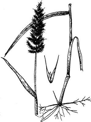 图2-7 棒头草 〔学名〕 Polypogon fugax Nees ex Steud. 〔形态特征〕 越年生或一年生草本,高15~75厘米。秆丛生,披散或基部膝曲上升,有时近直立,具4~5节。叶鞘光滑无毛,下部长于节间,中上部渐短于节间;叶舌膜质,常2裂或先端呈不整齐齿裂;叶片条形。花序圆锥状直立,分枝稠密或疏松;小穗含1花,长约2毫米,灰绿色或部分带紫色;两颖近等长,先端裂口处有1~3毫米长的直芒;外稃中脉延伸成约2毫米的细芒。颖果椭圆形。 〔生物学特性〕 种子繁殖,以幼苗或种子越冬。在长江中下游地区,10月中旬至12月上中旬出苗,在越冬过程中有部分幼苗被冻死,翌年2月下旬至3月下旬返青,同时越冬种子亦萌发出苗,4月上旬抽穗、开花,5月下旬至6月上旬颖果成熟,盛夏全株枯死。 种子受水沤泡,则有利于解除休眠。因而在稻茬麦田,棒头草的发生量远比大豆等旱茬地多。冬前出苗量多少,与麦播期有密切关系,早播则多,晚播则少。 种子成熟后,自然脱落入土,或随流水和风力传播,或通过作物种子调运夹带,分别向当地、近处和远距离扩散。 〔分布与危害〕 除东北和西北一些省区外,其他各地都有。适生于低、湿地或水边,在果园、苗圃及稻田地边亦常见。主要危害麦类、油菜、绿肥和蔬菜等作物。春季出土的棒头草受麦苗郁蔽抑制,生长矮小,对麦苗危害较轻。 |