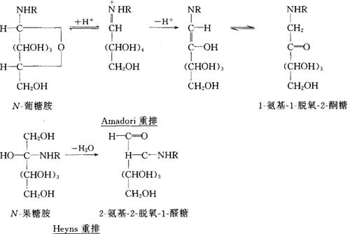 2.Amadori和Heyns中间产物 N-葡萄糖胺经分子重排形成Amadori中间产物 1-氨基-1-脱氧-2-酮糖。N果糖胺经分子重排形成Heyns中间产物-2-氨基-2-脱氧-1-醛糖。
