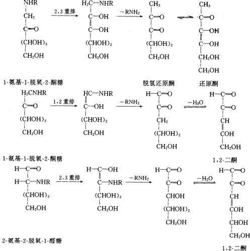 3.Amadori和Heyns中间产物的脱胺和还原酮以及脱氢还原酮的形成 1-氨基-1-脱氧-2-酮糖(Amadori中间产物)经加热生成还原酮或脱氢还原酮。Heyns中间产物(2-氨基-2-脱氧-1-醛糖)也可重排形成1,2-烯醇的形式,然后脱氨生成3-脱氧-1,2-二酮和3,4-烯-1,2-二酮。
