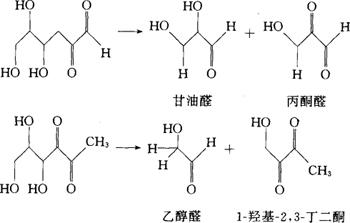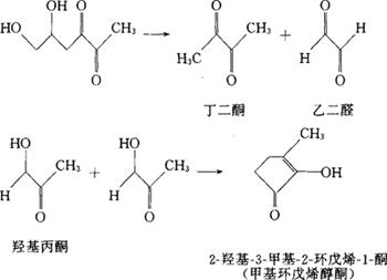 4.还原酮类的逆羟醛缩合反应 Amadori和Heyns中间产物重排脱氨形成还原酮和脱氢还原酮后,可进一步经逆羟醛缩合反应裂解生成丙酮醛、乙二醛、2,3丁二酮等二羰基化合物: