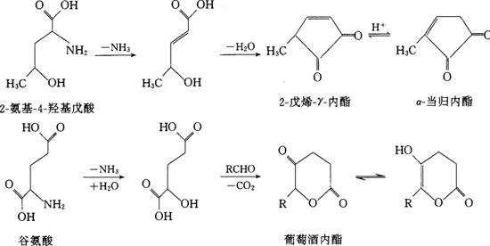 7.各种杂环化合物的生成 (1)内酯类化合物。氨基酸脱氨后生成不饱和脂肪酸,环化脱水形成内酯。氨基酸脱氨后与醛反应,脱羧后环化也生成内酯: