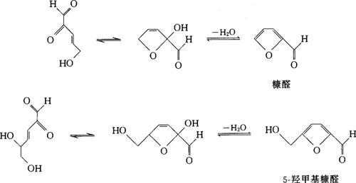 (2)呋喃类化合物。Amadori和Heyns中间产物重排脱氨形成还原酮类化合物后,可进一步环化形成糠醛类化合物。戊糖生成糠醛,己糖生成羟甲基糠醛。