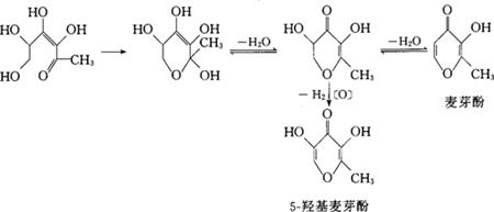 (3)吡喃酮类化合物。还原酮类化合物可以环化生成吡喃酮类化合物,如麦芽酚和5-羟基麦芽酚,这类物质具有明显的烤香味,在食品和烟草中普遍使用。