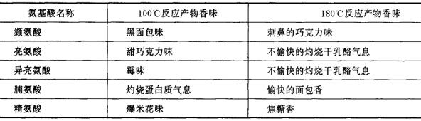 表5-6-15 两种氨基酸和四种糖类在pH为6.5和100℃时反应产生的香味