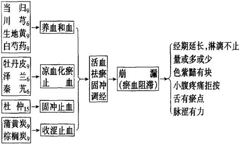 【要点】 四物汤加凉血化瘀及收敛止血之品,散敛并用,使瘀血得化,出血得止,止血不留瘀。 【应用】 盆腔炎症、子宫内膜炎或黄体萎缩不全等引起的经期延长。 【注意】 无瘀血者不宜使用。 【类方】 1.逐瘀止血汤(《傅青主女科》):由生地黄、大黄、赤芍药、牡丹皮、当归尾、枳壳、桃仁、龟版组成。功能活血化瘀,理血归经。主治瘀血内阻,兼有气机不畅的月经不调,经间期出血。 2.逐瘀止崩汤(《安徽中医验方选集》):由当归、川芎、三七、没药、五灵脂、牡丹皮炭、炒丹参、炒艾叶、阿胶(蒲黄炒)、煅龙骨、煅牡蛎、乌贼骨组成。功能活血祛瘀,固冲止血。主治瘀阻冲任之崩漏。 3.化瘀止崩汤(《中医妇科学》):由炒蒲黄、五灵脂、益母草、南沙参、当归、川芎、三七粉组成。功能活血祛瘀止痛。主治产后血崩。 4.止血灵(《湖北中医杂志》):由马齿苋、益母草、地榆、生蒲黄、茜草根、升麻组成。功能清热凉血,祛瘀止血。主治血热妄行导致的妇产科出血性疾患,如崩漏、月经过多、恶露不绝等。也可用于血热之吐血、衄血。 5.血崩统治方(笔者经验方):由地骨皮、益母草、茜草、仙鹤草、炙甘草组成。功能凉血、化瘀、止血。主治妇女血崩不止,势急量大,血色鲜红。气随血脱者加黄芪、当归。 |