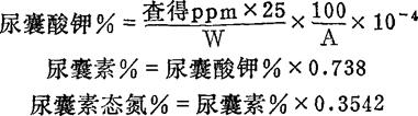 式中:A——显色时所取待测液毫升数; 0.738——尿囊酸钾(C4H7O4N4K,分子量214.222);换算为尿囊素(C4H6O3N4,分子量158.1164)的因数。 0.3542——尿囊素换算为尿囊素态氮的因素。 (五)注释 ①尿囊酸钾作标准液比尿囊素好,因钾盐较稳定,且易提纯。但计算时需换算成尿囊素含量。 ②实验要求0.5N氢氧化钠与0.5N盐酸浓度必须准确一致,试剂用量要求准确。 ③在冰盐浴中如果不冻结,可在冰箱中冷却30min。冰盐浴配制如下:100g冰与30g氯化钾混合。 |
