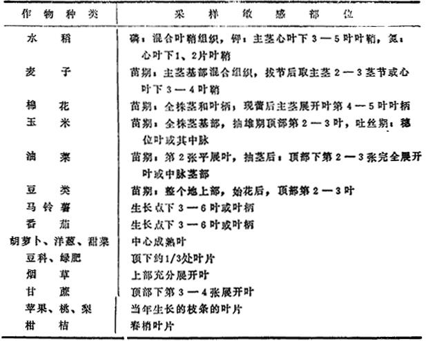 | 释义 | 植株内氮、磷、钾的速测及诊断 植株组织速测是估测植物组织中未被同化的无机养分,以反映植株养分的丰、缺情况。但化学速测结果只能作为田间诊断工作的一部分,它必须结合植物品种、外部特征(即长相)结合环境因素如土壤理化性状、排水、耕作、施肥等情况进行综合分析,找出限制因素,才能提出相应的合理措施。 植株样品的采集和处理:是保证速测结果能正确反映客观实际情况的重要环节。一般要求多点采样(一般在十株以上)使有充分代表性。采样时应注意植株的长相、长势,过大、过小以及受虫害、病害或机械损伤的植株都不应采集。如果为了某一特定的目的而采样时,就应该注意样株的典型性,并要同时另行选取有对比意义的典型株,以便在对比情况下说明问题。 营养元素进入植物体内后处于不断的代谢变化之中,不同作物与生育期以及不同产量水平条件下,植物组织中无机氮、磷、钾的含量比例都不一样,无机养分的变化不仅表现在不同器官上,即使在同一器官不同部位也有明显的差异,因此测定过程中,必须十分注意采样部位和时间,所以在同一生育期,每次植物组织速测必须采取相同部位和时间,否则结果不能相互比较。同时在把测定结果应用于诊断时,应区别各种植物的发育阶段及其相应指标,还应该考虑植物体内N、P、K营养元素之间的相互关系。 采样部位主要应选择植株上能最灵敏地反映养分丰缺程度的敏感部位。但由于植物种类、发育阶段和养分种类不同,敏感部位也随之而异,表12-4可供取样参考。 采样时间也很重要,因植株体内养分浓度随根系吸收和光合作用的相对强度而变化,一般尽可能在同样光照条件下采样,一般以上午8-10时为宜,但有些作物,如玉米也可在上午11时-下午3时进行采样。 植株养分的提取方法基本上是两种:一种是直接压榨取得汁液,另一种是用浸提剂浸提,把组织中的养分浸提出来。浸提法所测得的结果代表测试组织中所含养分的浓度,而直接压榨法所测得的结果则代表组织汁液中的养分浓度,就数值而言,其差额大小要看组织含水量及浸提效果(浸提一般都不能完全)而定。 表12-4 不同作物供诊断用的敏感部位