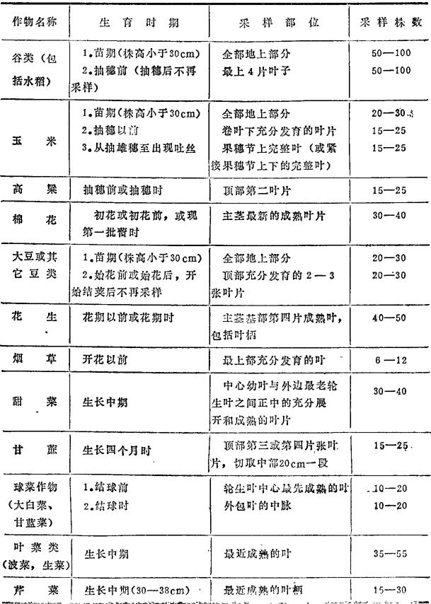 | 释义 | 植株样品的采集、制备和保存 植株样品是指植株茎、叶等组织样品,此类样品往往用于诊断植株养分残缺,研究植株体内养分转移流动方向,物质成分数量变化以及探讨作物阶段营养规律等等。采样时用于前几项目的常采集与分析元素密切关联的具有指示性意义的部位及器官进行分析,用于阶段营养规律研究的常进行全植株的采样分析。 一、样品的采集 在田间采样时,可象采集土样一样,按照一定路线进行,并在使生产不受损失或少受损失的条件下,尽量多采集样品,此外还应遵循下列原则: (1)受病虫害或机械损伤的植株不宜采样。 (2)当植物受高温,或干旱灾害影响时不宜采样。 (3)遮荫植株及有机肥料堆置处的植株不宜采样。 (4)植物组织上面有较大尘埃及泥土时不宜采样。 (5)茎叶部分特定部位的采样,一般应在植物生殖生长阶段初期或稍前期为宜。尤其是谷类作物,一般在授粉后不宜采样,因此时茎叶部分的养料浓度极不稳定,变化极大。生理上过分幼嫩的组织,由于养分组成变化迅速,也不宜作为特定部位的采样。 (6)一般不应用种子作其营养状态的鉴定。但却可用其发芽的幼苗来检定一些元素的残缺。 (7)生长不良的田块,植株取样数应比正常的多采些。 (8)样株采回后需要分不同器官测定(如分叶片、叶鞘或叶柄、茎、果……等)时,应在采样后立即将其剪开,以免养分转移。 (9)采样方法见表25-1,供参考。 表25-1 大田作物、蔬菜作物及果树的采样方法