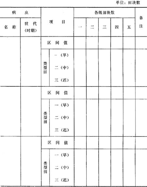 注:(1)该表数据根据当地大田抽样调查结果汇总统计,为全县的代表数 (2)各级别发生(为害)面积亩数依据抽样调查时该级别占种植面积百分比例数折算 (3)防治前的预计损失系指该发生级别在不防治情况下的自然损失,防治后的实际损失系指经过防治后(包括应治而未治的田块)仍然造成的产量损失。损失估计,全国或各省、市、自治区已经制定有统一标准的按统一标准折算,否则可按当地经验值进行估算;挽回损失=预计损失-实际损失 |