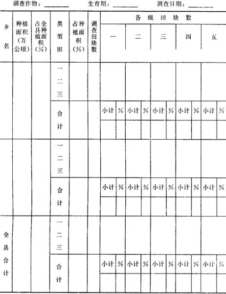 调查人员:____ 补充资料:该作物全县总产__吨,平均亩产____kg 注:1.各类型调查田块数的比例,与各类型田的比例不一致时,各级发生程度应先用加权法折算,再进行合计 2.本调查表作为发生情况抽样调查和为害情况抽样调查之用,并分别填写 表3-9 __县__年农作物病虫发生、为害情况抽样调查汇总表
