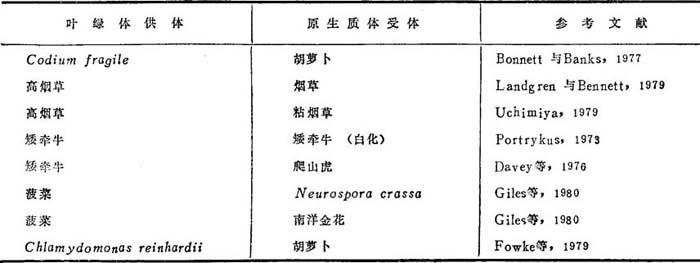 高等植物线粒体与真菌、酵母或动物细胞的很不相同。较大和变异很多。黄瓜的分子大小变异最大,同一家系内,线粒体基因组大小可相差7或8倍。至今高等植物线粒体基因组kb范围为250-2500。 线粒体基因组组织是独有的。复性动力学和限制性片段分析,指出其分子异质性。电镜分析指出大多数mtDNA存在着大线状分子,带有若干开环和共价闭环分子。环形DNA相对负数低,大小和相对数量有许多异质性。玉米至少观察到7级不同大小,从1.8-68kb,环形从少于1%-48%。马铃薯, 深知高等植物mtDNA的异质性,为什么这些基因组这样大,它们编码什么尚属未知。玉米线粒体基因组编码三种核糖体(rRNA),26s,18s和5s,以及18-20电泳区别的多肽。设想的鉴定其中4种多肽是细胞色素氧化酶亚单位I与Ⅱ,ATPase蛋白脂质和Varl核糖体蛋白质。很可能植物线粒体合成许多蛋白质,在哺乳动物或真菌线粒体未曾发现的。虽未能肯定其它们具有的格外DNA。 玉米线粒体基因组或是高等植物最广泛研究的mtDNA。由于设想细胞质雄性不育,病害感染性和籽粒大小降低,是线粒体编码的特性。由于线粒体的半自主性质,普遍存在,基因组的相对大小和其分子组织的信息,游离植物细胞器代表着巨大可能性,就是植物细胞原生质体的遗传转化。叶绿体或线粒体编码有益特性(如除莠剂抗性,或细胞质雄性不育)能以分离,纯化,通过融合技术转移给受体原生质体。游离的细胞器在转入受体原生质体前,也为人工培养遗传操作提供若干独特机会。 本节将开发和设想游离植物细胞细胞器对植物细胞遗传转化的潜在应用。还将鉴别技术和建议可能解答。 广大范围植物种和不同植株组织、愈伤组织培养体和细胞悬浮培养体都能分离,培养和再生。游离植物原生质体成为适于研究吸收各种生物材料的材料。若干初期研究清楚地证实了植物细胞原生质体经胞吞作用吸收聚苯乙烯颗粒。Willison等(1971)讨论了番茄果实原生质体颗粒吸与胞吞作用的关系。此外,许多研究指向植物细胞原生质体吸收微生物和病毒。如叶肉原生质体吸收烟草嵌合病毒和CaMV。但是,Cocking(1977)认为随着颗粒增大,只发生可以不计的微量的胞吞作用,大于0.5μ时,必需有特殊的逆境条件才能吸收颗粒。这些观察引导Davey与Cocking(1972)提出一种方法,能以产生质壁分离式的吸收微生物如固氮菌。基本上表明在质壁分离状态下,原生质体膜能使细菌陷入,包裹在原生质体内的小囊中。 Carlson(1973)报道细胞质编码的白化烟草突变体的原生质体吸收叶绿体后,细胞器吸收研究增多。再生了绿色植株,假定是野生型绿色烟草叶绿体掺入白化原生质体的结果。但是,由于没有论据指出受体细胞细胞质吸收叶绿体或吸收的结构分析,这种解释遇到相当多的反驳。此外,未能证实未处理的白化原生质体不能再生绿色植株。Potrykus(1973)提出偿试的特殊烟草白化突变体(周缘嵌合绿-自-白花叶突变体)经细胞培养可能产生绿色植株。 Kung(1975)报道白化烟草原生质体吸收野生种Nieotiana suaueolens的叶绿体,并再生绿色植株。后者具有叶绿体编码的N.suaveolens的典型的部分-I-蛋白质大亚单位,似可作为叶绿体吸收成功之例证。但是,这种再生绿色植株也有二亲种的部分-I-蛋白质小亚单位,提出至少有部分N.suaveolens基因组已经转移,最有可能是由于原生质体或亚原生质体融合而不是叶绿体的吸收的结果。Uchimiya与Wildman(1979)采用N.gossei的叶绿体和烟草原质体系白化突变体原生质体试验重复这种试验。未能观察到叶绿体吸入受体原生质体的论据。 许多学者用多种叶绿体供体和原生质体受体做叶绿体吸收试验(表16-2)。无例外地观察到叶绿体吸收,但外源叶绿体稳定地掺入受体细胞质和再生转化植株未获成功。应该注意到曾广泛研究游离核移植于原生质体。Lorz与Potrykus(1978)报道用不使受体原生质体成活力降低的培养条件,转移频率可达5%。未曾观察到移植核与受体细胞核间的核融合。 表16-2 植物原生质体吸收游离细胞器成功之例