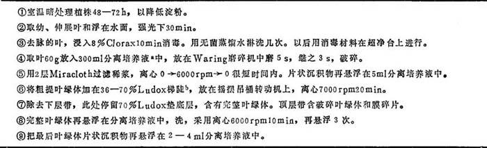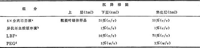 a.分离培养液含: 1μMNa4P2O7,50mM HEPES,0.33M山梨醇,2mM Na2EDTA,1mM MgCl2·6H2O,1mM MnCl2和5mM异抗坏血酸,pH6.8。 b.见表16-4。 表16-4 烟草叶绿体沉降用分步梯陡