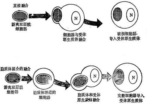 a.5×分离培养液含:5μM Na2P2O7,0.25M HEPES,2.0M山梨醇,10mM EDTA,5μM MgCl2·H2O和5mM MnCl2,pH6.8 b.异抗坏血酸缓冲液含:0.5M异抗坏血酸和0.05MHEPES,用6N NaOH滴定到pH7.0。 c.LBF由40ml Ludox AM,0.4g牛血清清蛋白,和0.4g Ficoll。 d.Cardawax 6000 硅溶胶梯陡也有利于分离和纯化线粒体。曾用菠菜叶和马铃薯块茎原生质体作为供体材料在不连续Percoll梯陡上分离和纯化线粒体。这种线粒体部分无其它夹杂的细胞器,证实了合理的线粒体酶活性。虽曾用蔗糖密度梯陡分离线粒体,但受到严重的渗透性破坏,使它不能用于成功地细胞器转移。应注意到许多植物源分离和纯化核取得成功。 2.转移方法 用常规分离和纯化法取得特定细胞器后,必须转移入受体原生质体。这种转化或吸收决不能损坏细胞器结构或功能。完成细胞器转移的最好机制是把游离细胞器与受体原生质体融合,好像原生质体相互间融合一样。许多学者确实采用这种方法。许多情况下,PEG有助于吸收。PEG媒介的游离叶绿体与原生质体融合的超微结构研究,深入揭示膜融合的复杂系列事项。光学显微镜观察结果,指出PEG使叶绿体导入原生质体的有效性。Davey等(1976)用电镜观察叶绿体吸收有关过程。从矮牵牛叶肉原生质体分离叶绿体。制品含70%完整质体。光学显微镜鉴定到3种类型:A型质体是完整的,具有典型双层膜被,表现全面正常。B型叶绿体也完整,但仅保留单膜,外层膜在分离过程中损失。C型叶绿体破碎,表现卵形或圆形。C型质体保留片层体系,但全部被复和基质一般是破损或不存在。用这种质体制品与爬山虎属原生质体经PEG6000媒介融合。电镜观察证实了全部三类叶绿体紧密地附着在原生质体质膜体。质膜体内陷而再封合,叶绿体为膜小囊所包围。甚至培养5天后,可测得含许多破损叶绿体的大的吸收小囊。 PEG处理后,A型叶绿体的二层膜融合成单层厚膜。这些叶绿体变成与原生质体质膜体紧密相联合,继之叶绿体被膜与质膜体融合,结果产生叶绿体基质与原生质体细胞质间的连续膜。实质上,只有叶绿体内含物传给原生质体细胞质。B型叶绿体行为与C型的相同。它们被包埋在质膜形成的小囊中,常见于原生质体细胞质。培养后,B型叶绿体的有限的膜与周围的小囊膜进行融合。因此很不可能保持其正常叶绿体功能。 PEG媒介的游离叶绿体与受体原生质体融合提出了细胞器吸收的二种要求:(1)要有传递体系引导游离叶绿体进入受体细胞质,以避免结构破坏,(2)必须有可选择遗传标志,以检测细胞器吸收是否成功。利用正的可选择的细胞器编码的遗传标志,将容许检测转化的原生质体,诚如微生物培养体中传统选择抗性突变或转化体一样。 Davey等(1976)观察和其他学者很少成功,要求寻找细胞器传给受体细胞质的另一种方法。包括脂质体包埋,亚原生质体,微原生质体和胞质体。近十年来脂质体研究较广泛,成为脂质双层膜间测定生理反应的模式系统。由于很多材料能包埋在脂质体内,其传递遗传物质进入植物原生质体,受到普遍重视。至今,脂质体已用于转移DNA,RNA,和叶绿体进入植物细胞原生质体。 脂质体包埋有很多优点:细胞器包在脂质小囊里,可保护不受PEG质壁分离的影响,否则会引起包被的融合。脂质体也能提供外膜,能与原生质体膜融合。脂质体带有一或更多细胞器,将与受体细胞质融合,最后放出其内含物进入受体细胞质。与细胞器-原生质体直接融合不同,脂质体传递的细胞器是完整的,并不为实际融合过程所损坏(图16-1)。Giles等(1980)用菠菜叶叶绿体包埋在脂质体中,并用PEG处理诱导与南洋金花或Neurospora crassa原生质体融合。二种受体原生质体吸收均告成功。采用放氧和叶绿素保持证实了转移的叶绿体的生理整体性。脂质体融合后,色素能保留3-4天,叶绿体与原生质体直接融合出有3-4h。融合后最初2.5h,曼陀罗属原生质体稳定地保持放氧,以后迅速下降。PEG直接诱导的叶绿体吸收结果,从融合后12min内,完全停止放氧。这些资料强有力地提出脂质体用于细胞器转入受体细胞质的潜势。