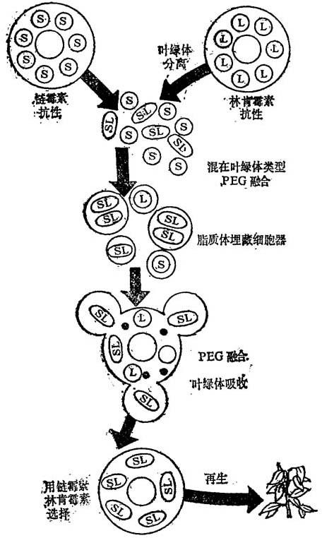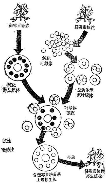 图16-1 游离的细胞器与受体原生质体直接融合或经脂质体媒介的埋藏细胞器转移入受体原生质体概略图 采用脂质体转移细胞器还有其它优点。可改变脂质体成分,以加强融合前脂质体与原生质体的凝集作用。采用正电荷脂质体已知能诱导脂质体-原生质体凝集和利于融合。此外,脂质体成分中可加固定化脂质,以保护包埋的细胞质活力。还有脂质体用作外源凝集素,使脂质体导向原生质体。用11个不同植物种制取原生质体.在特种外源凝集素存在下,出现凝集体。大豆凝集素附着在脂质体上的结果,增高脂质体与胡萝卜和烟草原生质体的结合,增高二者融合或包埋的细胞器传给受体细胞质。 亚原生质体或胞质体曾用于创造特殊的核质配合。但是,大多数情况下,转移的是混合细胞器群体,即叶绿体为线粒体所污染,或线粒体为核所污染等等。这与脂质体媒合融合结果显然不同,后者转给受体细胞质的是游离和纯化的。如果有了强有力生化选择方案,则融合后可选取需要的细胞器类型,但还付阙如。采用亚原生质体或胞质体也能排除采用有潜在价值的技术,即一旦游离细胞器转移成功后将会发生的。包括诱变发生,游离细胞器的遗传转化和细胞器融合。这些技术需要游离的和纯化细胞器,能在人工培养下操作,继之转入受体原生质体。亚原生质体中存在的细胞器,并不比原生质体融合有多大优点和易接受性。 3.选择方案 细胞器转移中,如有正选择方案用于检测转化的原生质体,这要方便得多。目前最常用的选择方法,是无色受体原生质体中掺入绿色叶绿体。此法简单,不须要特定遗传标志。但不易识别吸收的功能细胞器还是破损的。为此需要能检测特定细胞器类型和有效选择的精确方法。 许多抗生素抗性突变体曾证明对衣藻,酵母和原生质体融合后观察细胞器命运极为有用。高等植物研究最深的抗性突变体-遗传的和生化特性-是链霉素抗性。烟草突变体SR1的链霉素抗性的母性遗传与质体相关联。SR1突变曾广泛应用于原生质体融合异种间叶绿体转移。可见基于质体或线粒体的特定化学抑制剂抗性的正选择体系似乎是研究细胞器吸收的理想方法。 蓝茉莉花烟草也分离出母性遗传的林肯霉素抗性突变。林肯霉素是若干高等植物的叶绿体核糖体功能的极有效抑制剂。其抗性系LR 400对链霉素敏感,指出对每种抗生素是独立位点互作这种结果与Nierhaus等(1980)的发现相一致,即链霉素和林肯霉素与叶绿体中所见的原核型核糖体不同亚单位互作。 抗性突变如SR1和LR400可能很有用于证实细胞器吸收。图16-2表明采用遗传标志的叶绿体以控制原生质体吸收的可能方案。就此用于转移的叶绿体以链霉素抗性为标志。分离、纯化和脂质体包埋这些叶绿体,与受体原生质体融合。融合产物培养在加链霉素培养基上,由此只有为抗性叶绿体转化的原生质体能生长,分裂和最后再生完整植株。采用直接选择,吸收有生活力叶绿体的原生质体能分离得到。采用线粒体抗性对任一呼吸抑制剂抗性,也能设想相同方法。