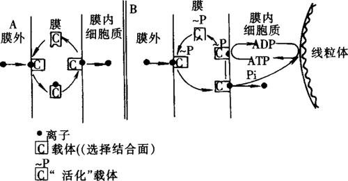 载体究竟是什么化合物,至今不太清楚。一般认为载体是生物膜上含有一定的能载运离子越过膜的分子。载体分子对一定的离子有专一的结合部位,能选择性地携带某种离子通过膜。载体的活化需要ATP,其转运离子的情况见图1-2。在膜的外部界面上,活化载体遇到与它具有亲和力的离子结合成载体——离子复合物,转移到膜内,与磷酸酶接触,能裂解出磷酸基,使载体失活,因而离子被释放到膜内的细胞质中,失活的载体在膜中磷酸激酶和ATP的作用下又可使其磷酸化,而再度活化,转移到膜朝外面的一边,再与膜外离子形成复合物。如此重复循环,就把膜外的物质不断运入膜内,积累于细胞内。载体磷酸化所需的ATP可由根的呼吸作用提供。