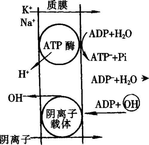 离子载体如缬氨霉素是一种环状多肽,环外是非极性的,能溶于膜脂,环内有羰基,能与K+结合形成复合物,使K+能越过膜的非极性区,进入细胞内。由于离子载体对各种离子有选择性,所以植物就有选择性的吸收。 总之,载体学说认为,物质透过膜是由于膜中的载体和物质结合后,在膜内从一面转向另一面(即转动180°),再将该物质释放出来。可是膜和载体的两侧都是极性的,中部都是非极性的,载体在膜中是难以转动的。因此,转运机制尚无定论。 ②离子泵学说:泵是指能量的意思。离子泵即可以在逆电化学势陡度的情况下将离子泵入或泵出细胞膜,实现主动运输的机理,这种泵能使细胞的离子成分和浓度维持稳定并不同于外界环境,离子泵能够在环境中溶质含量非常低的情况下吸收和浓集离子,以致使细胞内外离子含量有很大的不同。 离子泵学说是由Hodges(1994)所提出,该学说认为,质膜内的ATP酶能将ATP水解为ADP和Pi,释放出的能量可将离子泵入细胞内,如图1-3所示。图1-3说明了植物细胞吸收阳离子和阴离子,也描绘了ATP酶和阴离子载体。由于ATP酶的作用,使ATP水解,产生阴离子ADP-和阳离子H+(ATP+ ADP-+H2O→ADP+OH