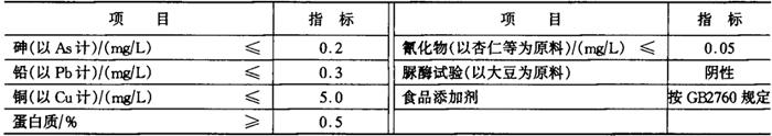 (三)检验方法 1.感官检验 (1)色泽与杂质 取50mL混合均匀的被测样品于洁净的样品杯(或100mL小烧杯)中,置于明亮处,用肉眼观察其色泽和可见杂质。 (2)香气与滋味 打开包装立即嗅其香味,品尝滋味。 2.理化检验 (1)砷 按GB5009.11规定执行。 (2)铅 按GB5009.12规定执行。 (3)铜 按GB5009.13规定执行。 (4)蛋白质 按GB5009.5规定执行。 (5)氰化物 按GB5009.48规定执行。 (6)脲酶试验 按附录A(标准的附录)执行。 3.微生物检验 (1)菌落总数 按GB4789.2规定执行。 (2)大肠菌群 按GB4789.3规定执行。 (3)沙门氏菌 按GB4789.4规定执行。 (4)志贺氏菌 按GB4789.5规定执行。 (5)葡萄球菌 按GB4789.10规定执行。 (6)溶血性链球菌 按GB4789.11规定执行。 (7)霉菌、酵母菌 按GB4789.15规定执行。 (8)商业无菌 按GB4789.26规定执行。 附录A(标准的附录)脲酶定性测定方法 A1 原理 脲酶在适当的pH和温度下催化尿素,转化成碳酸铵,碳酸铵在碱性条件下形成氢氧化铵,再与钠氏试剂中的碘化钾汞复盐作用形成碘化双汞铵。如样品中脲酶活性消失,上述反应即不发生。 脲酶定性测定方法详见本章第二节植物蛋白饮料豆乳和豆乳饮料QB/T2132内容。 |