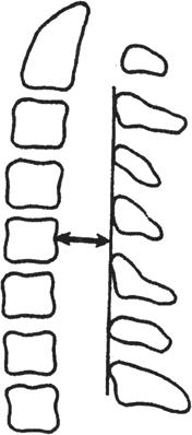 图1-20 椎骨脱位椎管矢径测量 于荣溥(1977)根据X线片测量,发现颈椎椎管矢径以C1~C2最大,二者个体差异可达1~5mm,而其他相邻椎孔矢径相差不过2mm。C3~C7椎管矢径,男性平均为16~17mm,女性为15~16mm;男性正常矢径最小为13mm,女性为12mm。 郭世绂对104例颈椎椎孔测量,椎孔矢径C1为17.9mm,C2为16.2mm,C3为13.0mm,C4为12.7mm,C5为12.8mm,C6为12.8mm,C7为13.1mm。椎孔横径C1为27.4mm,C2为21.6mm,C3为21.8mm,C4为22.7mm,C5为23.5mm,C6为23.8mm,C7为22.7mm。可以看出,C3~C6椎管矢径大致相同,C2~C4椎管横径大致相同。 郭世绂等(1988)对颈椎病不同类型X线片测量,发现脊髓型颈椎病患者的C2~C7椎管矢、横径均小于其他类型,也小于所有类型均值。各型各个节段的中矢径(椎体后面中点至椎板连合皮质线中点)均大于下矢径(椎体后下缘至相邻椎骨椎板连线最凸点连线的水平距离),C5下矢径在所有类型中最小。C3~C7椎管中矢径/椎体中矢径的均值为0.78,而椎管下矢径/椎体中矢径的均值为0.71。椎管下矢径与椎体中矢径虽不在同一平面,但因椎管下矢径和椎体后上、下缘连线中点至相应椎板前皮质线的水平距离相等,均为最小值,椎管下矢径/椎体中矢径的比值更能确切反映椎管矢径的大小。颈椎病患者损伤后,有时X线片上虽无明显骨折脱位,但固有潜在的颈椎管狭窄,可致严重脊髓损伤。 二、胸段椎管 胸段椎管大致呈圆形,T1椎孔横径(椎弓根间距)与C7相似,至T2~T3开始减小,T4~T10较稳定,大致为15~16mm,至T11~T12又增大。 胸段椎管矢径X线测量的为18mm,相邻上下椎孔横径可是1~4mm,而T4~T10变化较小,其矢、横径相似。T12横径较T11可大于l~4mm。 三、腰段椎管 L1~L2椎孔多呈卵圆形,L3~L4多呈三角形,L5多呈三叶形。 自L1~L2间隙以下包含马尾神经根及脊髓被膜,两侧各神经根自硬膜囊发出后在椎管内的一段称为神经根管,即侧椎管,各神经根分别经相应椎间孔(管)穿出。 (-)中央椎管 在腰椎侧位X线片上,腰椎椎管的正中矢径为自椎体后面中点至棘突基底距离,L1~L3棘突基底位于上、下关节突尖部的连线上。腰椎椎管X线测量矢径平均为17mm(14~20mm),最低值为13~15mm,男女性差别不大。横径(椎弓根间径)为两侧椎弓根内面连线,平均为24mm(19~29mm),正常最低值为18~20mm,在L2~L4最窄。男性椎管横径平均值较女性大1.1mm。 一般将腰椎椎管矢径小于13mm,横径小于18mm,定为椎管狭窄;如矢径为10~12mm,定为相对狭窄;如小于10mm则为绝对狭窄。L5椎孔横径虽明显增大,但其矢径甚至比L1~L2还小。各椎孔矢径中,以L3~L4最小。 郭世绂(1987)对腰椎椎管容量进行测定:L1为8.8ml,L2为8.5ml,L3为7.5ml,L4为6.7ml,L5为6.2ml,腰椎椎管总容量为37.4ml。自L1向下,各腰椎椎管容量顺序减少。 由于个人身材的差异,计算脊椎指数,即椎管矢径(C)及横径(D)的乘积与相应椎体矢径(A)及横径(B)的乘积的比例(CD∶AB),较单纯测量椎管矢径及横径更具有意义,正常CD∶AB应为1∶2.5~4。郭世绂(1984)测量数值显示女性脊椎指数均小于男性,L3、L4较大。如脊椎指数超过1∶4.5,即应疑有椎管狭窄;如连续两个椎骨比值均大于1∶4.5,临床意义更大。 L3~L4最易发生椎管狭窄。解剖因素为椎管矢径小,矢径与横径之比为0.67∶1~0.69∶1,虽大于L5,但小于L1~L2。脊椎指数最大,椎弓板较厚。 (二)腰神经通道 腰神经根自硬膜囊离开,直至从椎间管外口穿出,经过一条较窄的骨纤维性管道,统称为腰神经根通道。此通道分为两段,第一段为神经根管,从硬膜囊穿出点至椎间管内口,第二段为椎间管。 腰神经根离开硬膜囊后,前、后根或共居一鞘,或各居于固有的根鞘内。神经根管内宽外窄,前后略扁,如同外小口的漏斗(图1-21)。神经根斜向下外,自L1~L5斜度逐渐增加。神经根管虽然不长,有几个部位比较狭窄,可使神经根遭受卡压。
