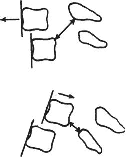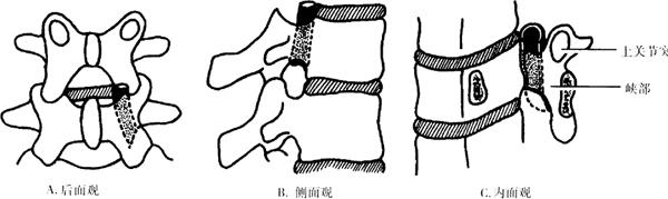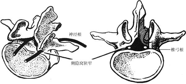 图1-22 侧隐窝狭窄时神经根受压情况 (3)上关节突旁沟(pararticular sulcus):腰神经向外经上关节突小面内缘所形成的沟。上关节突小面如呈球形增大,并有内聚,可使神经根遭受压迫。 (4)椎弓根下沟(subpedicular sulcus):椎间盘明显退变缩窄时,可使上一椎体连同椎弓根下降,后者与椎间盘侧方膨出形成一沟,可使通过的神经根发生扭曲。 (5)椎间管(intervertebral canal):腰椎椎间管分内、外两口,腰神经根通过椎间管,向外下倾斜,其在椎间管内走行长度比椎间管横径要长(图1-23)。