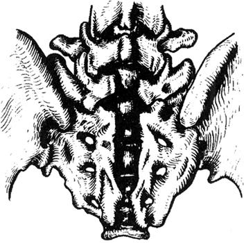 图1-24 第5腰椎及骶椎脊柱裂 S4棘突与左右骶角连线所围成的三角形凹陷即骶管裂孔,其位置可存在变异。骶管裂孔可为三角形、马蹄形、尖长形、方形、长方形,还有少数呈不规则形。有时在裂孔的尖端有向下伸延的骨片,将裂孔分为左、右两半;或有些小骨片突向腹侧;或骶管裂孔两侧缘向腹侧生出许多小骨片,相互连成两三个小孔;或骶角不显而几乎无裂孔,骶管裂孔也可向上高至S2(3%~7%)。所有这些变异都会在骶管阻滞麻醉时造成障碍。 |