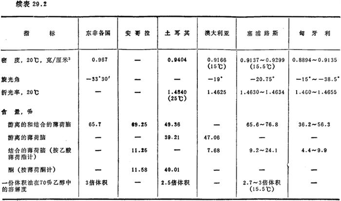 表29.8 根据英国标准(BS2999/39∶1971)各国精馏椒样薄荷油的质量指标