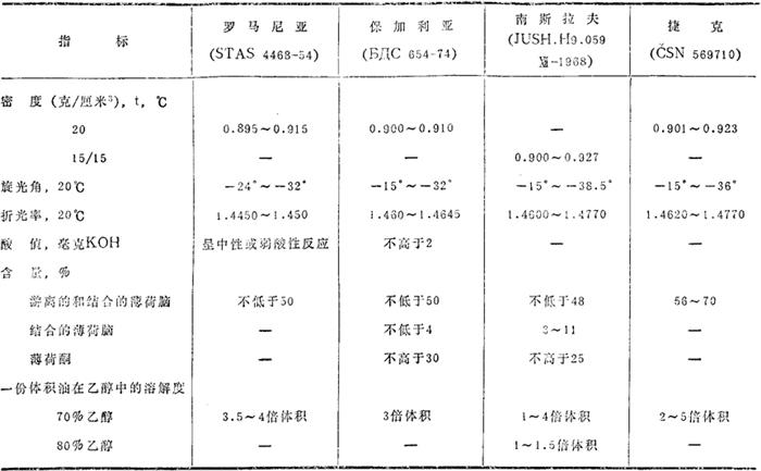 根据保加利亚、荷兰和匈牙利的标准,粗制椒样薄荷油应符合表29.4中的要求。 表29.4 根据各国标准粗制椒样薄荷油的质量指标