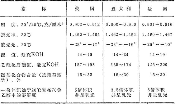根据全苏标准(OCT 18-167-74),粗制椒样薄荷油的质量应符合下列要求: 密度,20℃,克/厘米3 0.900~0.910 折光率,20℃ 1.4576~1.4702 旋光角 -16°~-31° 酸值,毫克KOH,不高于 1.5 含量,% 游离的和结合的薄荷脑,不低于 47 羰基化合物(按薄荷酮计),不高于 30 一份体积油在70%乙醇中的溶解度 4倍体积 精馏的椒样薄荷油的成分取决于提纯方法。苏联的精油工厂采用水蒸馏法,分离出少部分易挥发组分和高沸点组分,这样所得到的精馏油的成分与粗油的成分,其在单组分的数量方面是不同的,但其定性组成几乎不变。 使用真空精馏法,可从粗油中分离出大部分α-和β-蒎烯、莰烯、戊醇和异丙醇、乙醛及其他易挥发组分,还有部分的倍半萜烯烃。 各国生产的精馏椒样薄荷油的性质见表29.5,苏联产的见表29.6。 表29.5 各国生产的精馏薄荷油的物理化学指标