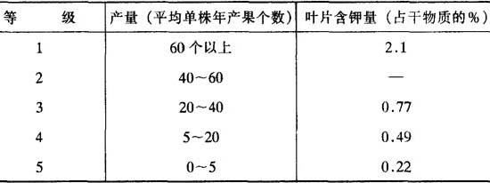 椰树缺氮时,幼叶绿色但少光泽,老叶出现不同程度的黄化,结果量减少,椰干含量降低。缺磷会引起根系发育不良和果腐。钾是成龄椰树各部分的主要成分,在所有元素中,椰子对钾的吸收最为强烈、迅速。缺钾时茎干细,叶短小,树冠中部叶片首先萎蔫,上部叶片向上簇伸,低部叶片枯干下垂悬挂于树干。据贝斯登等人研究,叶片含钾量与产量关系最为密切(表6-32)。施用钾化肥或优质草木灰等,对矫正椰树缺钾都有良好效果。6个月后,叶片开始转绿,枯叶逐渐减少,最后形成郁闭的树冠。 表6-32 叶片含钾量与椰树产量的关系 (热带作物栽培学“椰子”,1980)