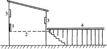 图10-4 楼圈式羊舍示意图 1.饲槽 2.漏缝地板 3.窗户 4.运动场 |
