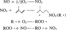 其中:Q=醌,QH2=氢醌 经儿茶酚水溶液与空气混合物的模型试验发现,上述反应形成的活性物质能穿透细胞核,与DNA结合,并造成DNA双螺旋分子结构的缺损。 (3)N-亚硝胺也是比较重要的有害物质,包括挥发性、不挥发性和烟草特有的亚硝胺。烟草特有的亚硝胺(TSNA)是烟碱和其他微量生物碱在调制、加工或抽吸过程中经硝化而形成的,其中含量较大的是N-亚硝基降烟碱(NNN)和4-(甲基亚硝胺基)-1-(3-吡啶基)-1-丁酮(NNK),它们可诱发田鼠患肺、口腔、鼻粘膜、食道、胰腺癌,致癌活性较强,TSNA在深色晾烟、白肋烟、嚼烟中含量高,马里兰烟、香料烟中含量较低,烤烟居中。 (4)某些内酯类(如香豆素)、农药残留、放射性元素(主要是210Po和210Pb)、无机元素(主要是As、Cd、Cr、Hg等)也是有害物质。 (5)烟碱虽然能使血压上升、心跳加快、神经兴奋,但烟碱在人体中的代谢很快,一般不会造成积累性伤害。 2.烟气气相部分 主要的有害成分是一氧化碳、一氧化氮、氢氰酸、丙烯醛、肼类、挥发性亚硝胺等。 (1)烟气中CO的浓度范围是0.3~0.4mg/支烟,由于CO与血红蛋白结合能力相当于氧气的250倍,所以它可减少血红蛋白携带氧的能力,导致人体缺氧,长期下去可诱发动脉硬化和高血压。 (2)新鲜烟气中的一氧化氮的浓度可达600μg/支烟,NO通过与氧气、烟气中的烯烃的一系列反应,形成NO、NO2和各种自由基的混合物,对人体的X-抗蛋酶(X-PI)有失活作用,从而可能引发肺气肿等疾病。NO产生自由基的机理如下: