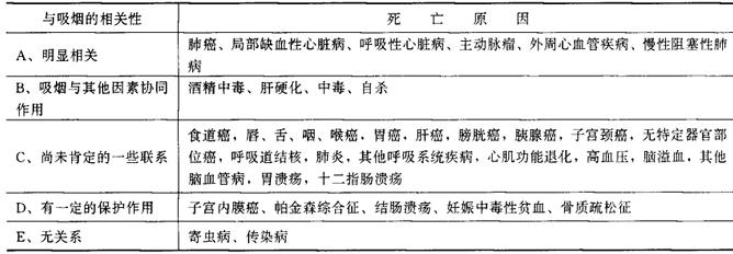 (3)氢氰酸主要来自烟叶中的硝酸盐、蛋白质和氨基酸(尤其是甘氨酸、脯氨酸、氨基二羟酸);丙烯醛主要来自烟草添加剂中的丙二醇、甘油等。氢氰酸和丙烯醛是具有纤毛毒性物质,能抑制呼吸酶的活性,并损害呼吸道粘膜。气相中微量的苯、挥发性亚硝胺和肼类属于致癌物质或辅助致癌物质,肼类主要来自抑芽剂如马来酰肼等。 (四)吸烟对健康的影响 国际癌症研究所在1986年出版专辑报告,据有关吸烟者及不吸烟者死亡病因的调查统计,把吸烟对健康的影响归纳为5种情况,见表2-4-1所示。 表2-4-1 吸烟与死亡病因的关系