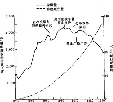 近年来的研究还证实,吸烟能预防老年性痴呆、旅游综合征、注意力下降、溃疡结肠等疾病。 (五)吸烟与健康之间尚无直接的因果关系的结论 在流行病调查方面,由于有大量其他因素共存,如导致肺癌的因素有20多种,包括饮食习惯、营养、空气污染、遗传、α-辐射(如建筑物氡辐射)等。难以得到吸烟与疾病之间有直接的因果关系的结论。 流行病学调查也有不少令人费解或相互矛盾的事实,例如,从1964年到1992年,美国的吸烟率从1964年的50%降低到1992年的29%,但肺癌的发病率却一直在直线上升,肺癌死亡人数从1964年的40000人增加到了1992年的126000人(见图2-4-1)。