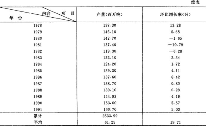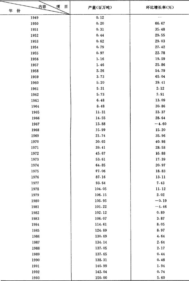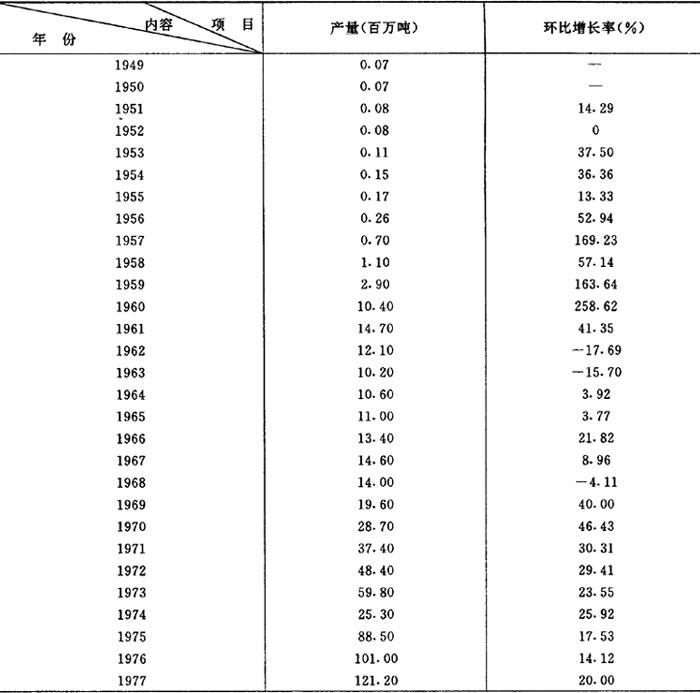 | 释义 | 概况 1.中国石油天然气工业发展简况 中国是最早发现和利用石油、天然气的国家之一。 早在公元前一、二世纪,中国古代人民就已在东北一带发现了石油。天然气在中国的开发利用时间更早,甚至可以追溯到公元前的秦汉时期。在漫长的历史过程中,中国人民不仅发明了先进的钻井工具,摸索出了成熟的钻井技术,而且发明了用竹筒和木头制成的输气管线。这种管线能够翻山越岭、涉水过河。明朝之前,输气管线已可延伸一二十华里。 但是,现代石油工业的发展是从新中国成立后开始的。 1949年,中国原油产量只有0.12百万吨,天然气产量0.07×108立方米。1949~1989年的四十年间,全国共发现油田332个。中国埋藏浅、油质好的大油田——大庆油田,是1960年发现的。大庆油田的发现,使中国原油产量一下子有了一个大飞跃。1963年12月26日,《人民日报》庄严地刊登了一条令全世界注目的重大消息:“中国人民用洋油的时代即将一去不复返”。中国石油天然气工业也从此进入了一个新的发展阶段。 以后十几年间,胜利、华北、辽河、新疆、河南、中原等一大批大型整装油田相继发现并投入开发,1978年,中国原油产量由1977年的93.64百万吨增长11.12%,突破100百万吨大关,达到104.05百万吨。1978~1992年间,中国累计生产原油1825.93百万吨。1993年,中国原油产量又上了一个新台阶,共生产原油150.00百万吨。 历史地考察,中国石油工业经历了四个高速发展阶段。1949~1960年,石油工业在旧中国非常弱小的石油工业基础上飞速增长,最高年增长速度约66.67%。十二年平均原油产量年增长率约为38.18%。到1960年,原油产量已达5.2百万吨。这是中国石油工业第一个高速增长时期。 第二个高速增长期大约是1963~1966年。这次高速增长主要来自大庆油田的开发。四年间,原油产量增长平均水平约为26.49%。其中,1965年原油产量为11.31百万吨,比1964年原油产量的8.48百万吨增加了33.37%。 第三个高速增长期是1967~1976年。这十年石油工业的年增长速度一直在两位数水平上,其中,1970年原油产量增长率竟高达40.98%。 这三个高速增长期是1967~1976年。这十年石油工业的年增长速度一直在两位数水平上,其中,1970年原油产量增长率竟高达40.98%。 这三个高速增长期,从根本上改变了中国石油工业落后的面貌,并为1978年原油产量突破100百万吨打下了坚实的基础。 第四个高速增长时期是1982~1988年。这一时期,原油产量增长是在较高水平上发生的,虽然幅度比前三个阶段都小,并且小不少,但绝对增长量并不少。1988年生产原油137.05百万吨比1982年的102.12百万吨净增长34.93百万吨。 根据近年来的勘探开发新形势、新情况,1993年,原油产量一下子跃上了150百万吨,年增长率在6%左右,参见表1.3.1-1。 表1.3.1-1 1949~1993年中国原油产量表