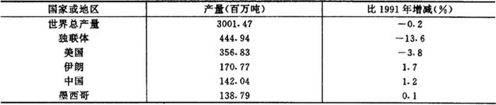 历史地考察,自1949年至1991年,天然气产量先后出现了四次增长、三次下降。这表明我国天然气工业具有较为明显的波动性。 1949~1991年,我国共生产天然气2633.99×108立方米。 1991年,陕甘宁又发现了大气田,我国天然气工业今后将出现一个更大的发展。 在中国石油天然气工业发展的四十多年间,页岩油工业也有了较为显着的发展。目前,茂名油页岩基地已经全面投入开发。页岩油加工业不断发展。在美国等西方石油大国炼油能力下降的大背景下,中国的页岩油加工技术和页岩油工业一直蓬勃发展。 中国的石油加工业已经发展到了比较成熟的阶段。1991年,中国共加工原油113.63百万吨,生产汽油23.45百万吨、煤油4.06百万吨、柴油27.66百万吨、润滑油1.73百万吨、化工轻油8.01百万吨。 2.中国石油工业在世界上的地位 我国石油工业经过几十年的发展,目前已经具备了自成体系、产量稳定、投资活跃的油气勘探开发特色,并实现了产油大国的理想。近年来,中国原油产量连续名列世界第五位。 1992年,世界原油总产量为3001.47百万吨,其中中国原油产量约占4.72%。产量超过中国的只有4个国家,即独联体(444.94百万吨)、沙特阿拉伯(410.34百万吨)、美国(356.83百万吨)和伊朗(170.77百万吨)(表1.3.1-3)。由表1.3.1-3可以看出,1992年世界原油产量比1991年下降了0.2%左右。由于前苏联解体,独联体国家原油产量下降了13.6%:美国原油产量继续下降,幅度竟达3.8%。由此可见,1992年中国原油产量的增长,无疑是对世界石油产量稳定的一大贡献。 表1.3.1-3 1992年世界原油产量