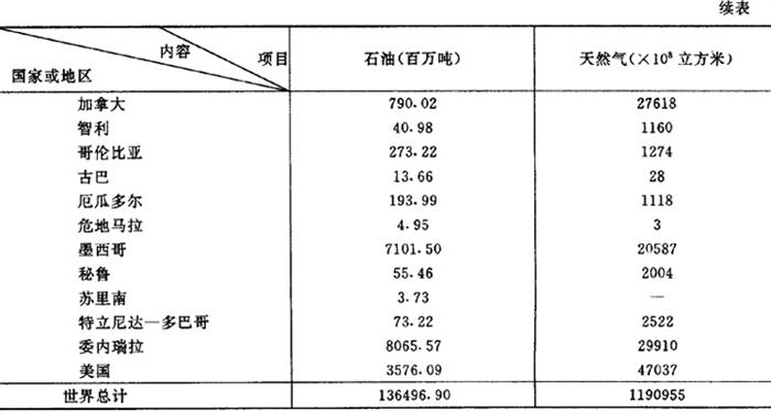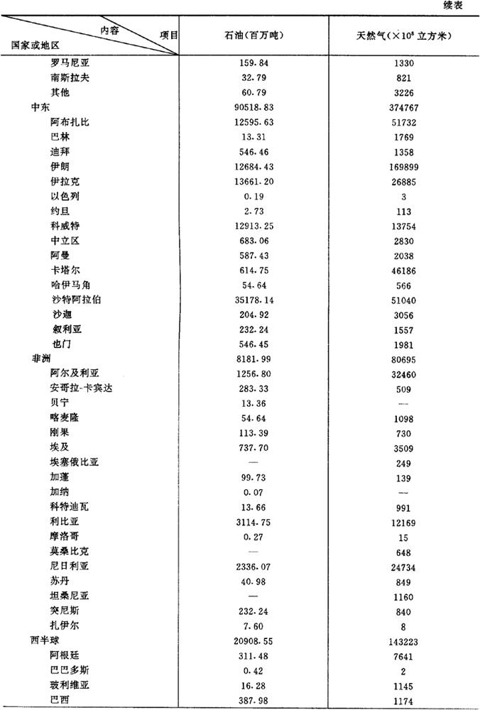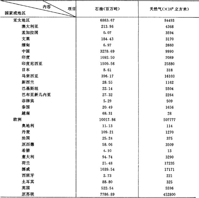 (1)中国石油工业是世界石油工业的一部分 虽然石油天然气资源的分布极不均衡,但是经过世界各国的共同努力,人类所在地球表面的很多地方都有油气发现,石油开发国家已有100个以上。在石油开采国这个大家庭里,有的国家储量极其丰富,石油储量竟多达35178.14百万吨,天然气储量多的竟达4528×1010立方米;有的国家资源储量相对很少。中国石油天然气资源相当丰富,1991年初的探明石油储量约为3278.69百万吨,占世界同期石油探明储量的2.40%,占亚太地区石油探明储量的47.77%;天然气储量约9990× 108立方米,占世界同期天然气储量的0.84%,占亚太地区天然气探明储量的11.82%。 从石油储量看,排在中国前面的国家或地区有沙特阿拉伯(35178.14百万吨)、伊拉克(13661.20百万吨)、科威特(12913.25百万吨)、伊朗(12684.43百万吨)、阿布扎比(12595.63百万吨)、委内瑞拉(8065.57百万吨)、独联体(7786.89百万吨)、墨西哥(7101.50百万吨)和美国(3576.09百万吨)等9个。中国石油探明储量名列世界第十位(表1.3.1-4)。 表1.3.1-4 1991年世界油气探明储量