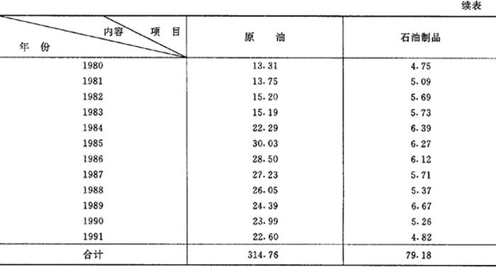 中国石油天然气工业的发展,不仅从能源供应上支持了中国经济的发展;同时也使中国有可能出口原油和石油制品,从创汇的角度对中国经济提供支持。 1970~1991年的21年间,中国共出口原油314.76百万吨,出口石油制品79.18百万吨(表1.3.1-6)。仅出口原油一项,已累计为中国经济提供了400亿美元的外汇。 表1.3.1-6 1975~1991年中国出口石油情况 单位:百万吨
