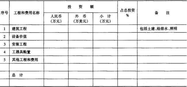 | 释义 | 概算编制说明 (1)工程概况及编制范围 说明项目的性质、生产规模、产品品种、主要单项工程、工程总投资和总建筑面积。 (2)编制依据 填写批准设计的依据、说明编制概算采用定额或指标、设备和主材的价格依据以及执行的取费标准和有关规定。 (3)投资构成及分析 按工程费用性质划分列出投资构成分析表(见表6-10-1), 表6-10-1 饮料厂概算投资构成分析表