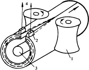 图7-22 高频接触焊原理 1-挤压辊 2-电极(接触头) 3-阻抗器 4-高频电源 高频感应焊工作原理见图7-23。高频电流通过感应器在工件表面感应出涡流而加热,工件与高频电源之间无机械接触,要求工件内有完整的闭合电流回路。这种焊接方法由于无电极与工件间的接触,适用于薄壁件的焊接。