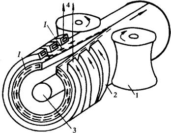 图7-23 高频感应焊原理 1-挤压辊 2-感应器 3-阻抗器 4-高频电源 I-焊接电流 I′-循环电流 |