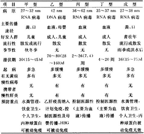 | 释义 | 概述 病毒性肝炎是由肝炎病毒所引起。最初认为是胆管的卡他性炎症,故称为卡他性黄疸,以后认识到其为全身性疾病,又称为包特金氏病。1942年,Voegt证明其有传染性,才称为传染性肝炎。 1955年开始应用血清酶学检测方法,为肝炎病毒感染的检测提供了较敏感的标志,并可检测出无黄疸型肝炎,使本病的流行病学得到进一步的阐明。1963年,Blumberg发现澳大利亚抗原(简称澳抗,后称肝炎相关抗原,现称乙肝表面抗原),认识到这种“澳抗”阳性的肝炎主要通过血液传播,称之为血清性肝炎或同种血清性肝炎。而将非血液传播的“澳抗”阴性的肝炎称为传染性肝炎。以后随着对本病的认识的深入,将传染性肝炎改称甲型肝炎,将血清性肝炎改称乙型肝炎。 1970年前,乙型肝炎是输血后肝炎的常见原因。后来,虽采用灵敏的方法检测乙型肝炎标志筛选献血员,仍发生大量的输血后肝炎,因而,Prince等1974年提出了非甲非乙型肝炎(HNANB)。1980年Wong等报告肠道传播的非甲非乙型肝炎。随着对输血后非甲非乙型肝炎的深入研究,又发现此种肝炎病毒可能有不耐氯仿的、能形成管状结构的长潜伏期型和耐氯仿的、不能形成管状结构的短潜伏期型两种。1977年Rizzetto发现了δ因子,随后又命名为丁型肝炎。 1989年Choo等应用分子克隆技术获得肠道外传播的非甲非乙型肝炎的基因克隆,并将这种肝炎命名为丙型肝炎。同年Reyes等应用分子克隆技术,获得肠道传播的非甲非乙型肝炎的基因克隆,并将此种肝炎命名为戊型肝炎。1989年9月在日本东京召开的国际非甲非乙型肝炎及血液传染性会议上正式命名。 因此,病毒性肝炎至少有5型,即甲型、乙型、丙型、丁型及戊型。从流行病学方面可分为两类。一类包括甲型和戊型,主要经消化道传播,有季节性,可暴发流行,不转变为慢性;另一类包括乙型、丙型和丁型,主要经血液传播,无季节性,多为散发,可变为慢性。5型病毒性肝炎的特点如表1。 表1 5型病毒性肝炎的特点归类表