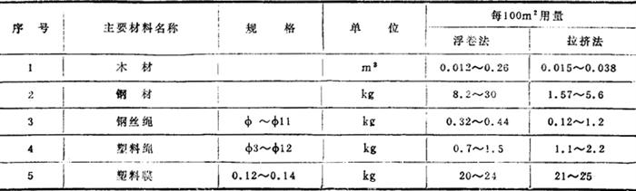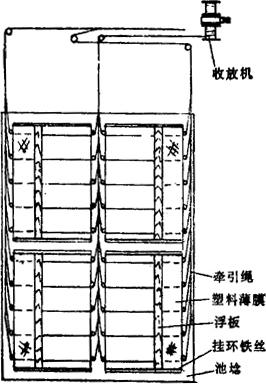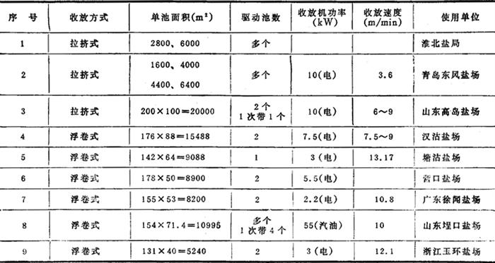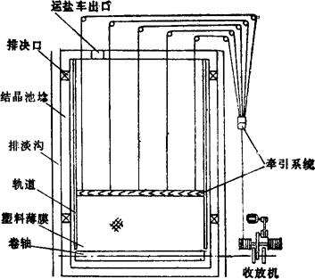塑料薄膜苫盖结晶池,是结合我国海盐生产自然条件而创造的一种先进生产技术。降雨前,用塑料薄膜覆盖在结晶池卤水液面上,将雨水隔离在薄膜之上,并随时排出池外;雨后收起薄膜,恢复生产,从而保护盐层和卤水,减少降雨损失,对稳产、增产起到明显效果。薄膜收放有两种结构:拉挤式和浮卷式。拉挤式结构(图2-8-9)包括:薄膜、浮板、滑索、滑轮、牵引绳和驱动设备。经常是几个结晶池共同使用一个驱动设备。其结构简单,投资少;但用工多,薄膜使用寿命较短(3~4年),多用于面积较小的结晶池,一般不大于7000m2,但有的也达到20000m2。浮卷式结构(图2-8-10)包括:薄膜、浮卷轴、浮板、入轨器、滑轨、滑轮、牵引绳和收放机等。收放机主要型式有一机带两池和两机带一池两种,其结构比较复杂,投资高,但机械化程度高,薄膜使用寿命长(5~6年),适用于面积较大的结晶池(多在10000m2左右,有的已达到16000m2)。部分盐场塑苫设备性能见表2-8-7。塑苫材料消耗情况见表2-8-8。
