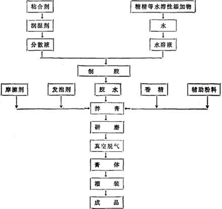 | 释义 | 概述 牙膏是由摩擦剂、粘合剂、发泡剂、润湿剂、香料和水等混合组成的膏状物质。它是与牙刷一起用于清洁牙齿、保护口腔卫生的日用必需品。 牙膏从成分上来分,可分为普通牙膏和药物牙膏两大类。在普通牙膏中又可分为碳酸钙型、磷酸氢钙型、氢氧化铝型和二氧化硅型等。从膏体的形态上来分又可分为白色牙膏、绿色牙膏、透明牙膏、半透明牙膏、彩条牙膏、彩粒牙膏、珠光牙膏和微胶囊牙膏等。药物牙膏按其功能基本上可分为防龋牙膏、脱敏牙膏、去结石牙膏和消炎牙膏等类。 牙膏生产工艺流程