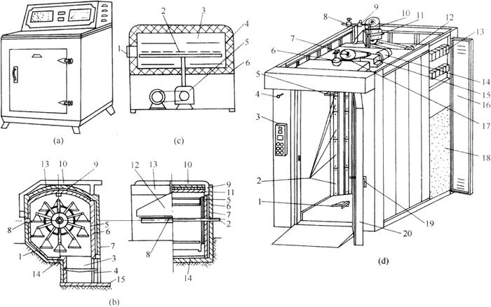图3-1-12 几种典型的箱式烤炉 (a)箱式烤炉外形 (b)风车炉结构 1-转篮 2-转轴 3-焦炭燃烧室 4-空气门 5-炉内壁 6-保温层 7-炉外壁 8-炉门 9-烟道 10-烟筒 11-挡板 12-排气罩 13-炉顶 14-底脚 15-燃烧室底脚 (c)水平旋转炉结构示意图 1-炉门 2-加热元件 3-烤盘 4-回转支架 5-传动装置 6-保温层 (d)ZDTM25-50旋转式热风循环焙烤箱 1-防偏件 2-热风调节器 3-控制箱 4-排风手柄 5-吊钩 6-排风口 7-吊钩限位装置 8-截止阀 9-电磁阀 10-电机 11-皮带张紧器 12-风机轴承座 13-电器箱 14-电机 15-蜗杆减速器 16-电器门 17-吊钩轴承座 18-加热装置 19-关门手柄 20-烤室门 烤盘固定式箱式炉炉膛内安装有若干层支架,用以支撑烤盘,电热元件与烤盘相间布置。隔层式烤炉将各层烤室隔开,彼此独立,每层烤炉的底火与面火分别自动控制,可实现多种制品同时进行烘焙。在烘焙过程中,烤盘内的食品与电热元件间没有相对运动。 烤盘固定式箱式炉的特点是:体积小,使用灵活,烘焙范围大,但其内温度、湿度分布不均匀,影响烘焙质量,且生产能力小,适合于中小型食品厂使用。 风车炉主要由炉体、转盘吊篮、燃烧室及传动系统等部分组成。这种烤炉多采用无烟煤、焦炭、煤气等为燃料,其特点是热效率高,产品质量高,尤其适用于烘焙面包,但手工装卸食品,劳动强度大。 水平旋转炉内有一水平布置的回转烤盘支架,摆有生坯的烤盘放在回转支架上,烘焙时,食品在炉内回转,使得制品烘焙均匀。旋转式热风循环烤箱,烤室顶部装有吊钩,用于悬挂烤车,下部有防偏件,以固定烤车(见图3-1-13)。烤箱分为加热器和烤室两部分,加热器上方设置有风机,以强制气流循环。在热风的出口设置有风量调节器和加湿装置。加湿装置由时间继电器控制电磁阀来控制进入蒸发器的水量。通过调节风量,可保证食品的色泽和成熟度一致。烘焙时,在吊钩的传动下,烤车缓慢旋转,加之强制循环的热风,使食品各部分均匀受热,有效地保证了食品的烘焙质量。