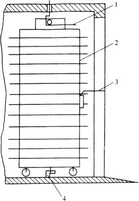 图3-1-13 烤车固定示意图 1-吊钩 2-烤车 3-推车把手 4-防偏件 (二)隧道炉 隧道炉炉体很长,为60~100m,烤室为一狭长的隧道,食品在沿隧道做直线运动的过程中完成烘焙。根据传动方式不同,隧道炉分为链条隧道炉、钢带隧道炉和网带隧道炉。链条隧道炉生产能力大,产品质量好,能适应多种产品生产,但设备利用烘盘作载体,要求配备大量的烘盘,且进炉和出炉操作比较麻烦。钢带和网带炉易与食品成形机械配套组成连续的生产线。钢带强度大,热损失小,运转过程中会产生弹性振动,跑偏现象较网带大;网带网眼空隙大,在烘焙过程中制品底部水分容易蒸发,不会产生油滩和凹底,运转过程中不易产生打滑、跑偏现象,缺点是不易清理,网带上的污垢易粘在食品底部。 隧道炉主要由炉体部分、加热系统和传动系统三部分组成(见图3-1-14)。各种隧道炉的炉体部分和加热系统基本相同,而传动系统差异较大。