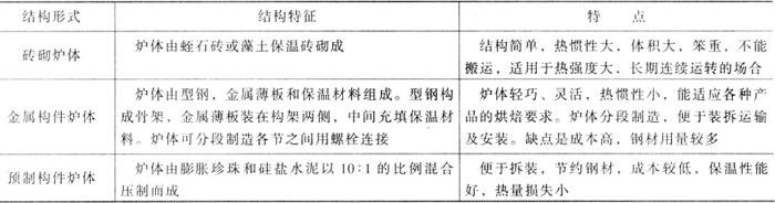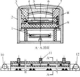 图3-1-14 隧道炉结构示意图 1-下托辊或调偏机构 2-炉体外罩 3-上托辊装置 4-炉带 5-炉顶 6-电加热管 7-炉墙 8-炉体机架 9-石棉保温板 10-驱动滚筒 11-排汽管 12-改向滚筒 1.炉体 炉体的结构有3种形式:砖砌炉体、金属构件炉体和预制构件炉体。表3-1-3所列为3种炉体结构的特点。 表3-1-3 隧道炉结构形式和特点